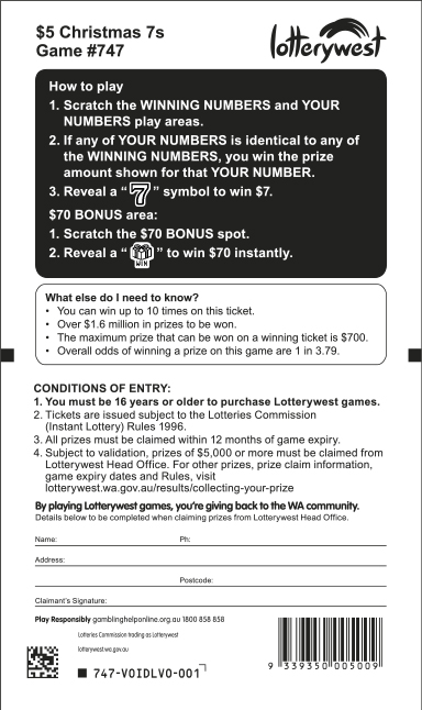 Overall odds refers to the chance of winning a prize across all tickets distributed in Western Australia for the entire game, not for a batch of tickets sold at one location to an individual. Winning and losing tickets are randomly distributed across the state.