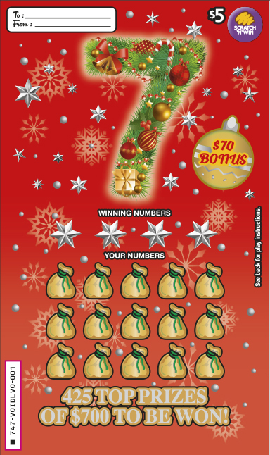 Christmas 7s has over $1.6 million in Total Prizes with 425 Top Prizes of $700. If any of Your Numbers are identical to the Winning Numbers you win the corresponding prize. Reveal a '7' symbol to win $7. 1 Bonus Game is included with the chance to Win $70 instantly.