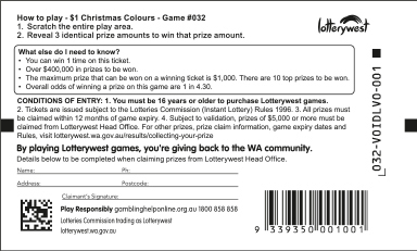 Overall odds refers to the chance of winning a prize across all tickets distributed in Western Australia for the entire game, not for a batch of tickets sold at one location to an individual. Winning and losing tickets are randomly distributed across the state.