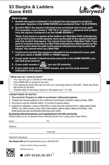 Sleighs & Ladders has over $900,000 in Total Prizes with 3 Top Prizes of $10,000. Scratch the square numbered 1 to indicate the next square to reveal and continue to scratch the squares indicated to reveal your path until you reach a Game Over or the FINISH Square - if you reach a FINISH square, you win the prize shown in that square. If your path reveals 3 identical prize amounts in the game board, you win that prize amount. If your path reveals a 'Gift' win symbol, you win $5 instantly.
